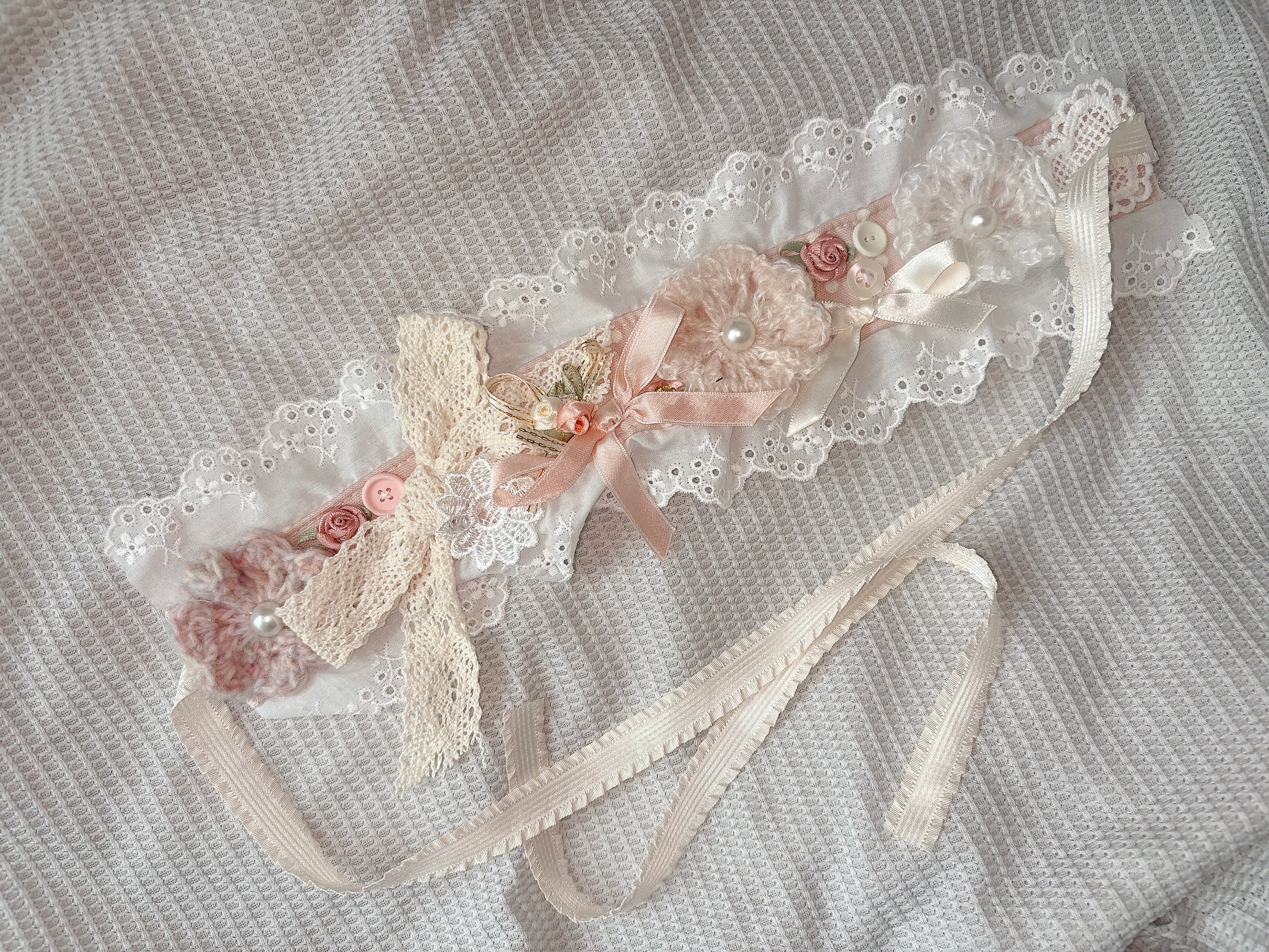 手編みのお花やリボン、ボタンなどがぎゅっと詰め込まれたヘッドドレス❁⃘*.゚
