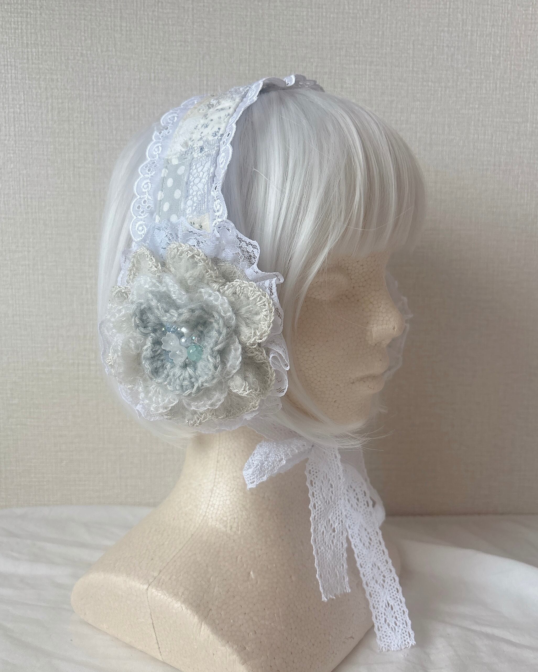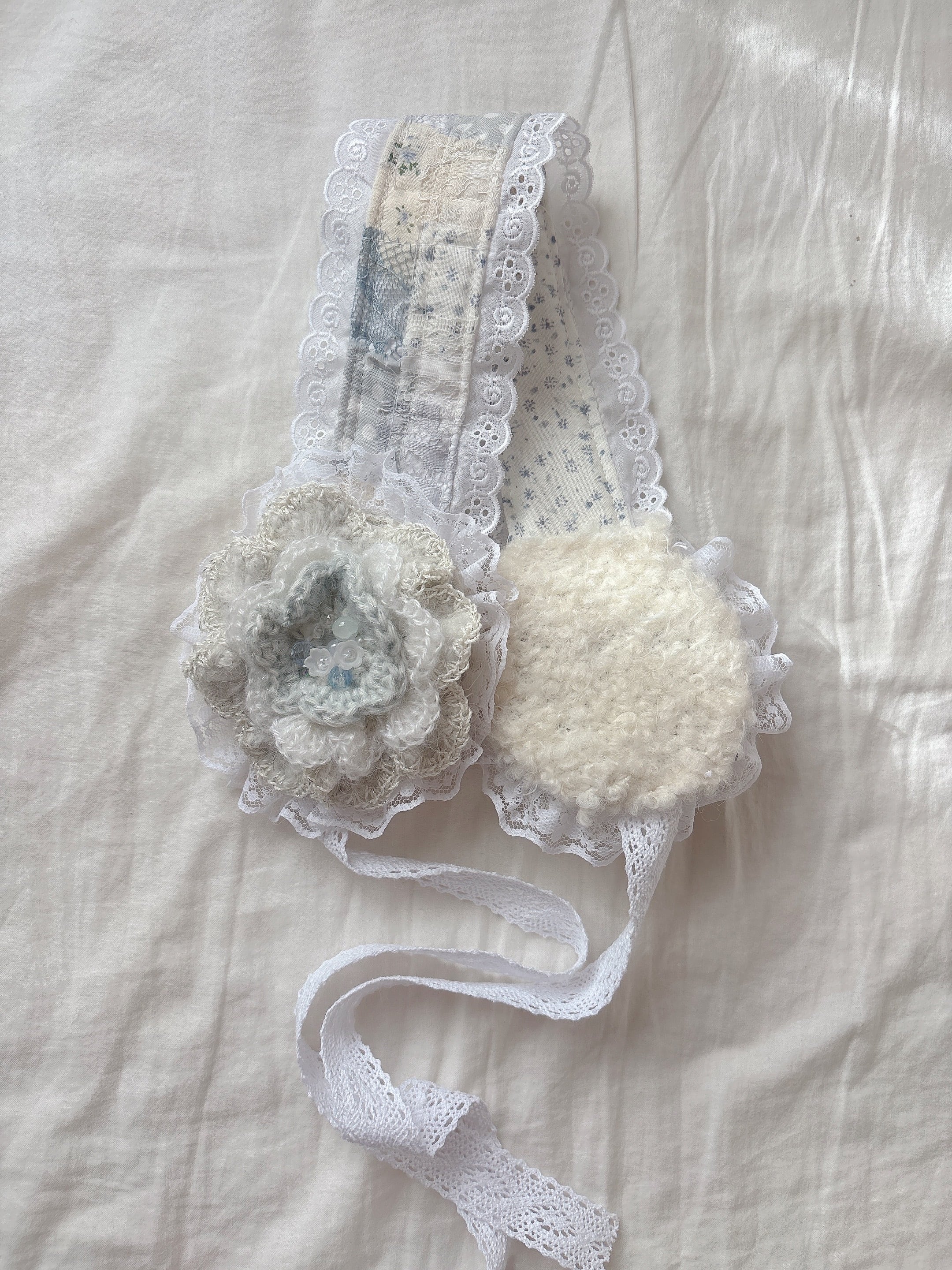 ふわふわ手編みお花のイヤーマフ【みずいろ】
