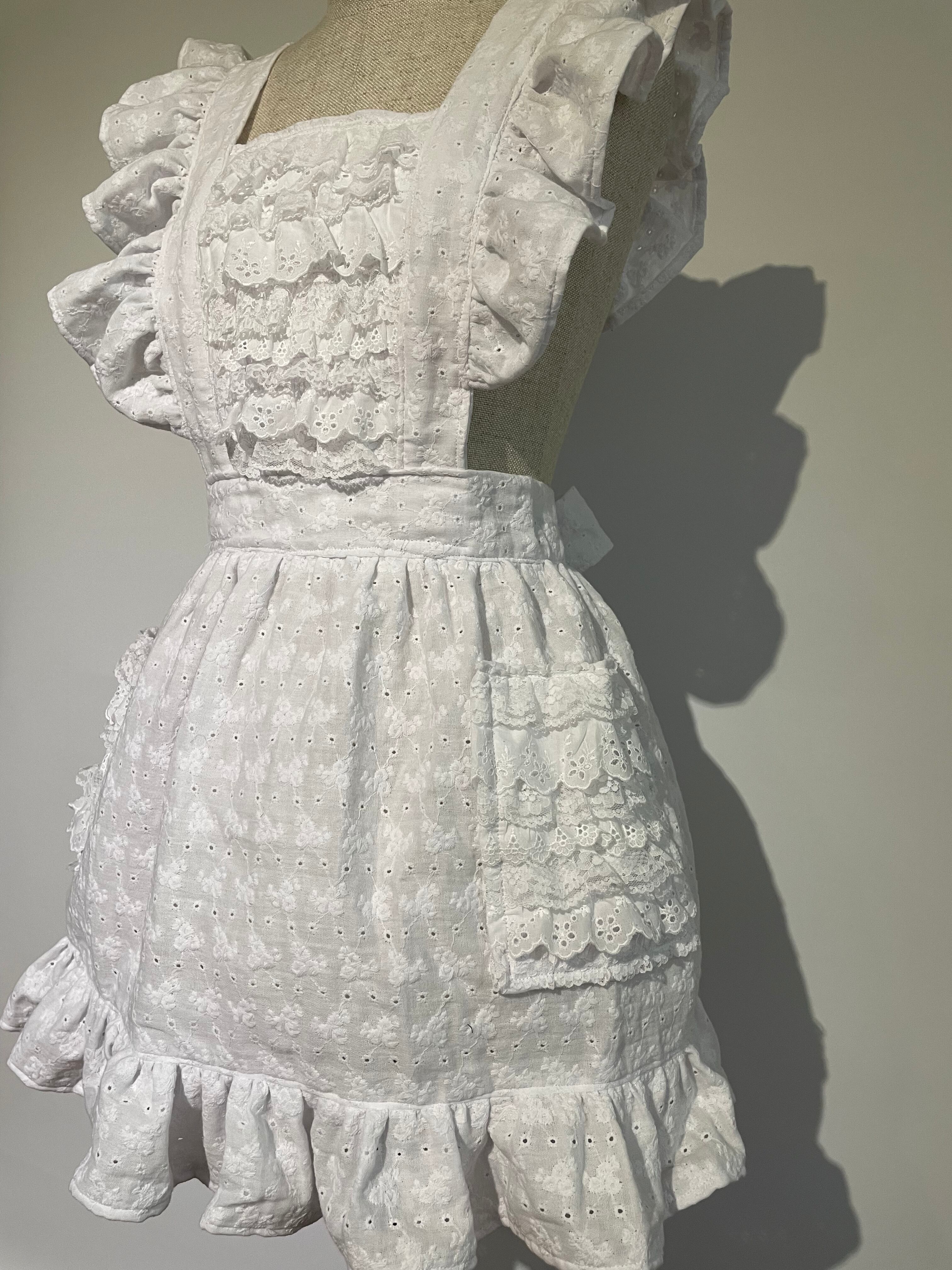 胸とポケットの部分にたっぷりフリルが付いた、ガーリーなエプロン。