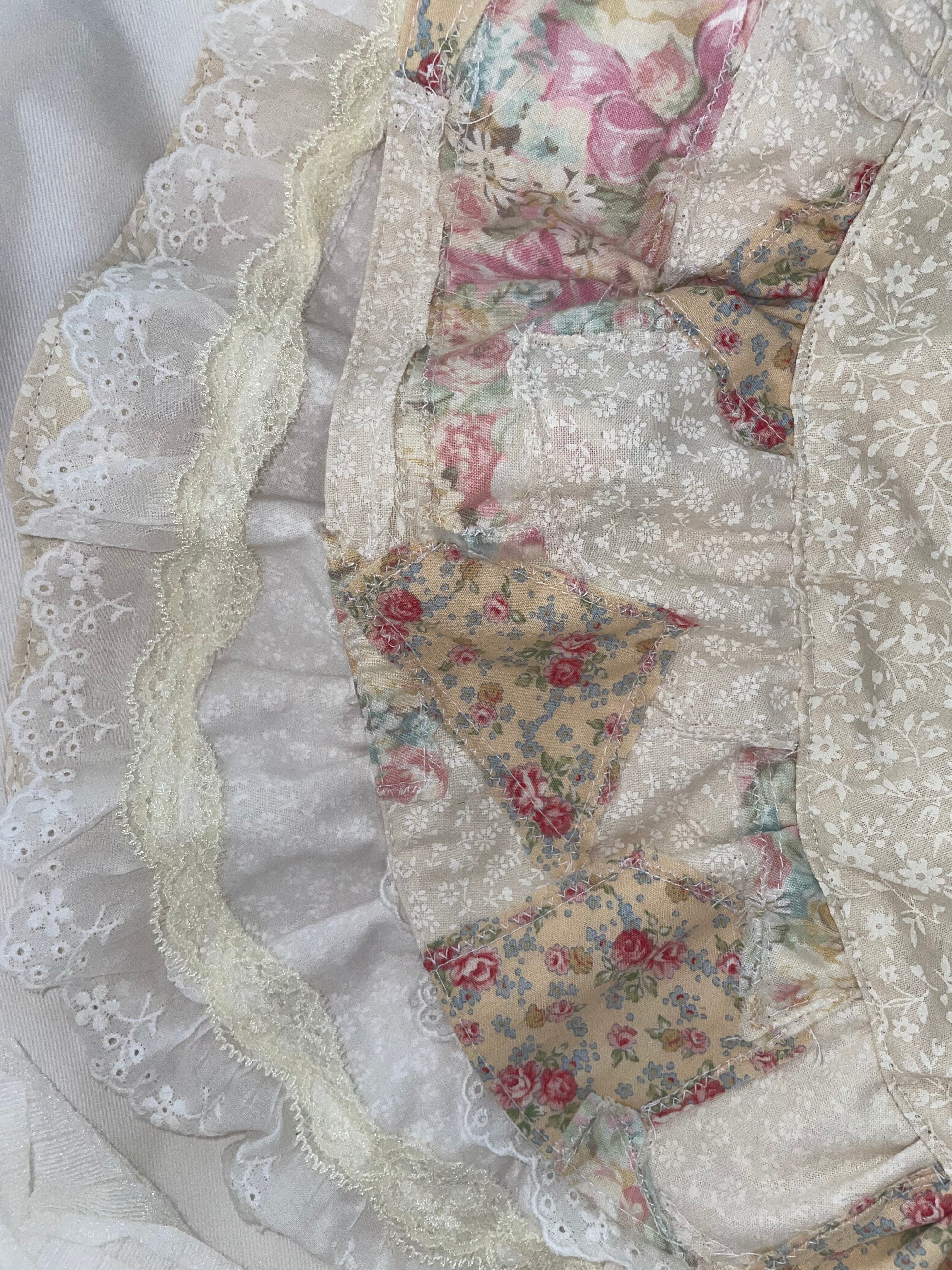 パッチワークを施した、存在感のあるボンネット。