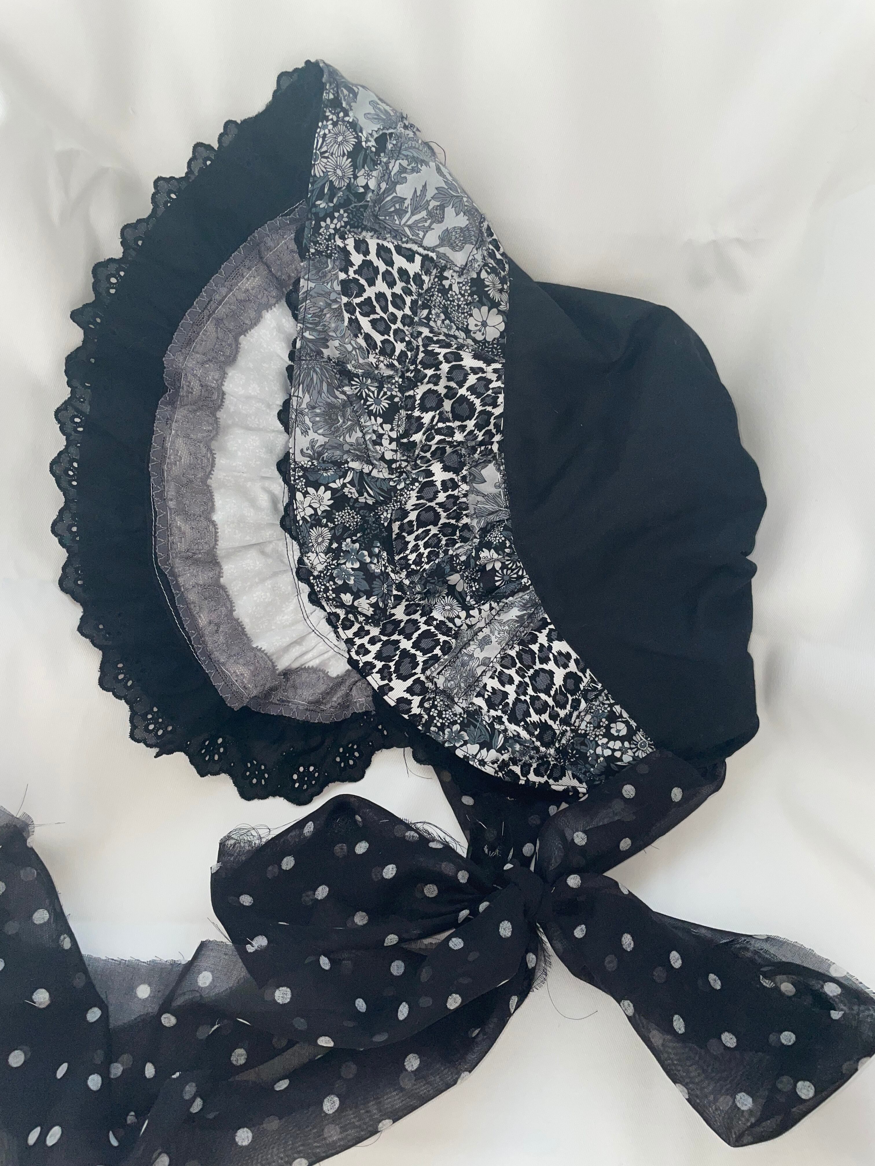 パッチワークを施した、存在感のあるボンネット。